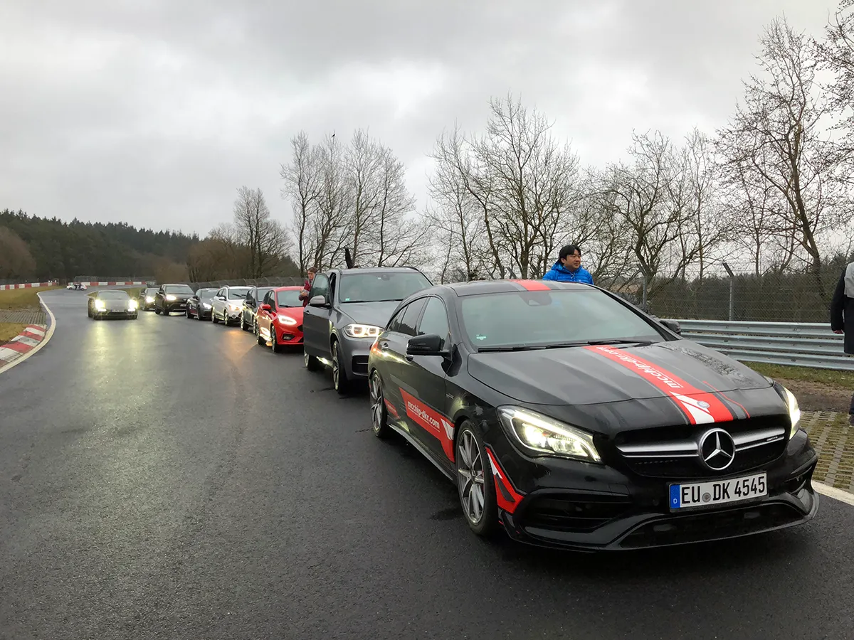 レース2・3日前にはニュルブルクリンク主催の講習会やトレーニングが行われ、mcchip-dkr社から借りているAMG CLA45にて慣熟走行を行いました。この日は終日雨でさらに気温も低く、コース上所々にはまだ雪が残っている状態でした。