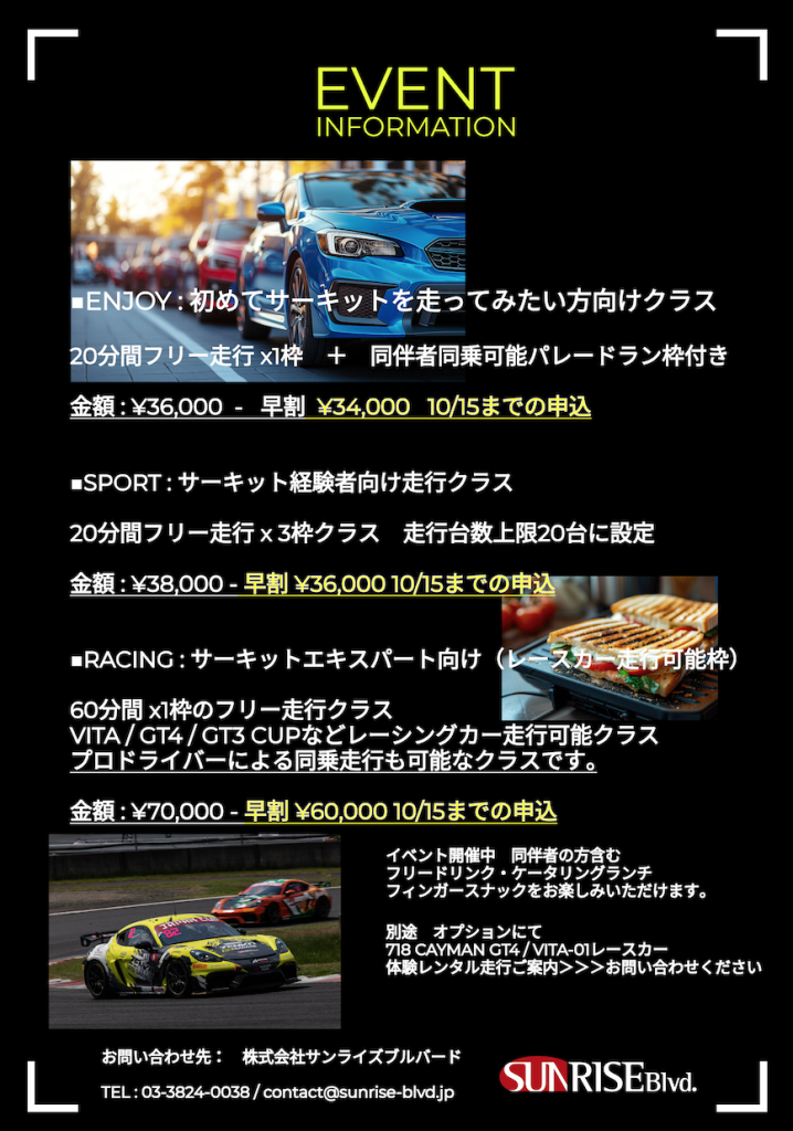 走行枠は混雑を避けるために台数制限を設けておりますので各クラス募集台数には限りが御座います。