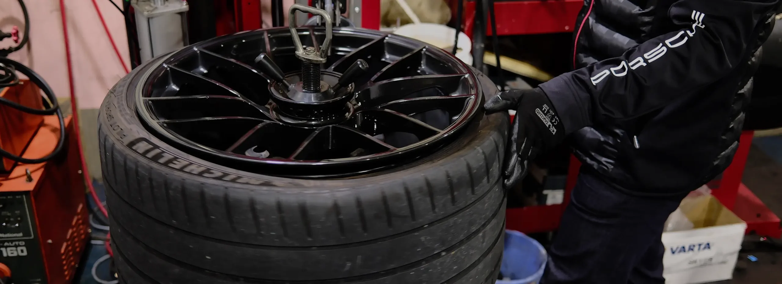 最新のレバーレスタイヤチェンジャーを使用。組替え作業時のホイールへの傷を防止し、大径扁平タイヤにも対応しています。