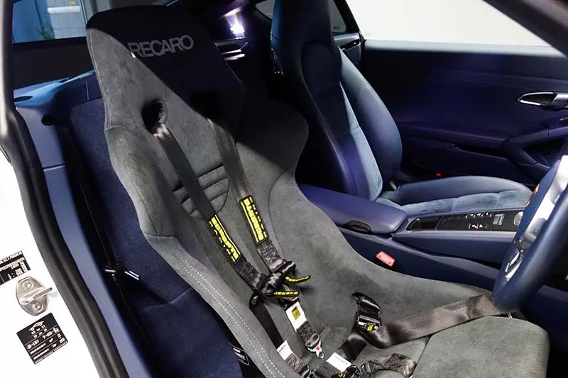 ポルシェ981ケイマンSのこれからサーキットを本格的に走行されるということで、サスペンションやブレーキ、タイヤホイール、安全装備のバケットシート+ハーネス取り付けなどを行いました。サスペンションにはOHLINS DFV車高調整式サスペンションに社外の偏心ピロアッパーマウントを組み合わせサーキット向けに仕様変更。