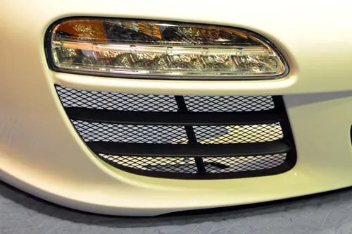 ポルシェ997カブリオレの車両、開口部の大きなフロントバンパーダクト3面にゴミの混入やラジエター破損を防ぐためにメッシュ施工を行いました。純正装着されているかのようにスッキリとした仕上がりで違和感なくお取付頂けます。開口部の大きなフロントバンパーダクト部にご覧のようにブラックアルマイト処理を施したメッシュを施工します。落ち葉や飛び石の混入を防ぎラジエター破損防止に繋がります。