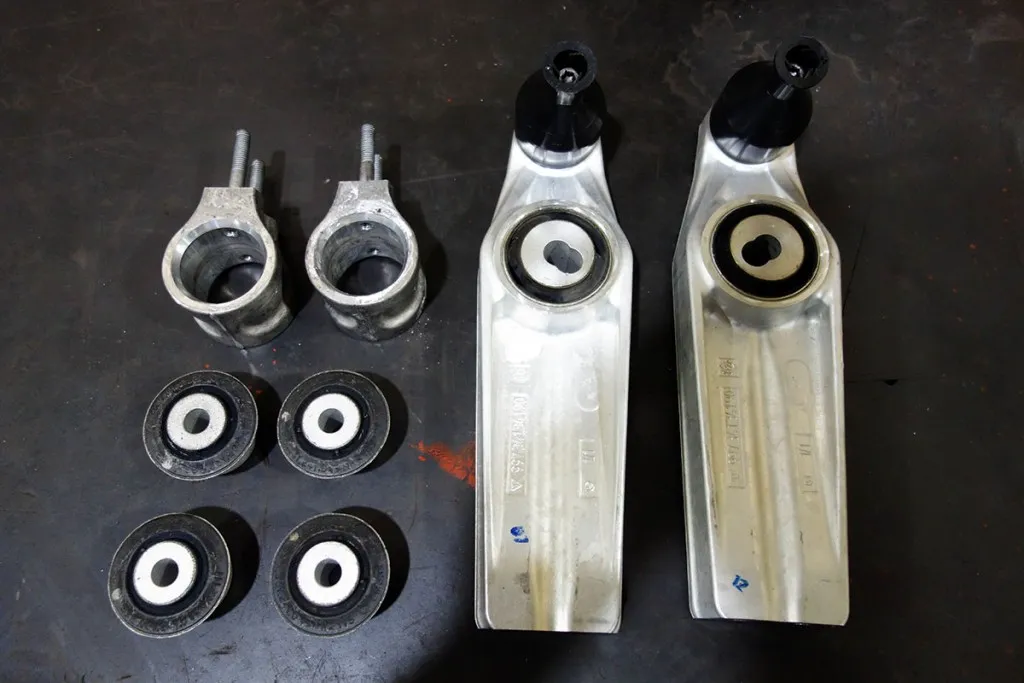 ポルシェ後期997GT3 3.8Lの足回り異音修理のご依頼を頂き、オイル漏れの発生していた純正ダンパーの交換・傷みの発生していたフロントコントロールアーム・ブッシュの交換作業を実施。フロントショックは倒立式ショックアブソーバーのため、劣化によりケースシールやベアリングにガタが生じてきます。Fロアアームブッシュには劣化により亀裂が発生しステアリングを切った際に異音が発生しておりました。