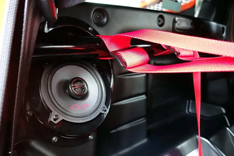 ロータスV6エキシージSのサーキット走行に向けた安全装備のご相談をいただき、運転席シートはエスケレート製ロータス専用バケットシートに交換を行い、ロータス専用ハーネスバー・6点式ハーネスステーを使用して6点式ハーネスを装着しました。このハーネスバーは純正ロールバーに直接固定するタイプの商品で、ハーネスバーの中で最も強度・安全性を確保できる取付方法です。純正リアスピーカーは専用移設キットで移動させハーネスが取付できるようになっており多少の加工が伴いますが綺麗にフィッティングが可能です。